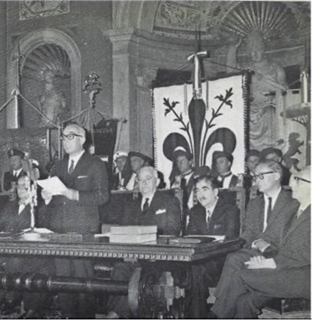 Figura 8. Il ministro della Pubblica istruzione Luigi Gui pronuncia il discorso per la chiusura del centenario dantesco, Firenze, 30 aprile 1966.