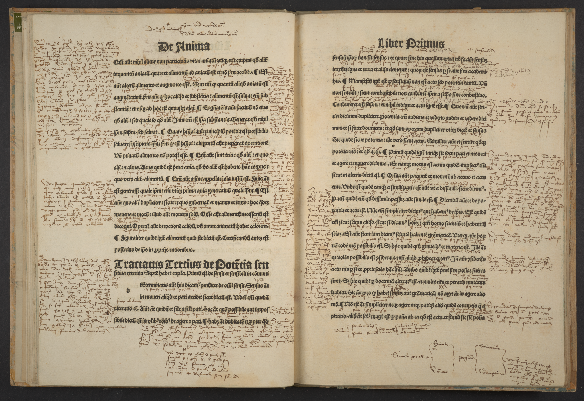 The historical Aristotle was a teacher as well as a philosopher. He tutored students individually and also at a school that he established in Athens called the Lyceum. Many of his surviving philosophical works are understood to be versions of lecture notes from his students or texts that were developed within the context of teaching. Because of their encyclopedic range and systematic style, starting in the Middle Ages, Aristotelian texts were the backbone of school and university curricula across the Middle East and Europe. Within natural philosophy (what we might call science), the Aristotelian framework wasn't displaced until the 17th century, though it persisted even longer. Still today, works by Aristotle are widely taught and studied. The items in this collection highlight students engaging with Aristotle, either by learning from the teacher directly or through the time-honored tradition of working with his texts.