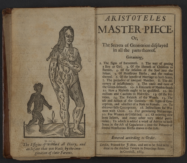 This is the first edition of an infamous sex manual that claimed Aristotle as its author. The frontispiece shows, according to the description, “The Effigies of a Maid all Hairy, and an Infant that was born black, by the imagination of the Parents.” It claimed all characteristics were a result of something the mother saw or thought during conception and pregnancy.