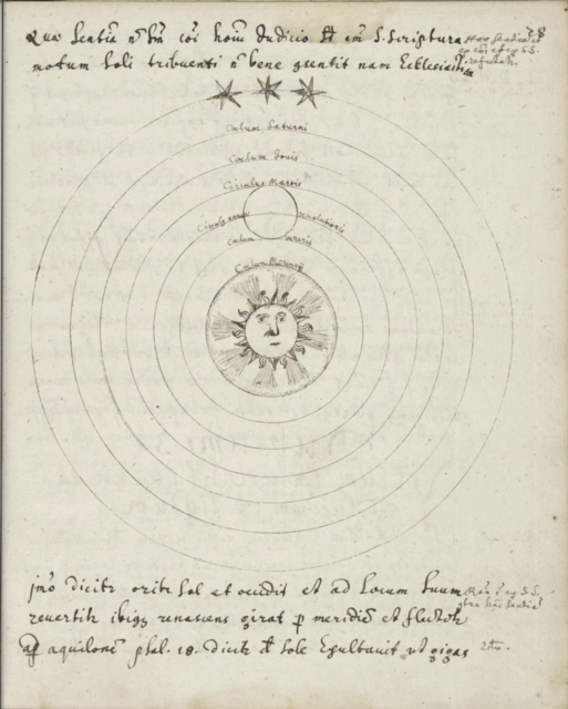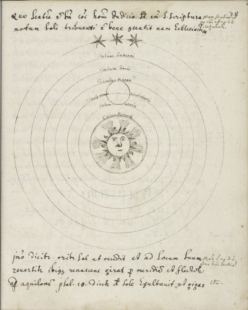 This manuscript, scribed by the otherwise unknown Johannes Zorn, is likely based on classroom explanations of Aristotle’s On the Heavens, Meteorology, and On Generation and Corruption held in Ingolstadt in 1614 (see f. 13r). The context is almost certainly the University, which had been taken over by Jesuit professors. The unnamed author of these considerations offers a series of questions and dubia in typical scholastic style and mentions fairly recent developments in astronomy, such as the observation of comets and sunspots. Although the professor does not agree (given the evidence of experience and the Holy Scriptures) with newer cosmological views, on ff. 27v–28v the notes refer to the models of the universe by Nicolaus Copernicus and Tycho Brahe; the figure reproduced here (f. 28r) offers a depiction of the heliocentric system, which was to be considered alongside illustrations based on the standard geocentric model given on previous pages. It is an open question to what extent such illustrations were part of classroom teaching or were created and inserted by students after the fact, but the commentator is aware of recent developments and discusses them openly, often adducing the authority of the Scriptures and Catholic theologians. The scribe, Johannes Zorn, also scribed UPenn Ms. Codex 771, which contains a commentary on Aristotle’s Physics. That work contains no illustrations, but proceeds in a very similar manner.