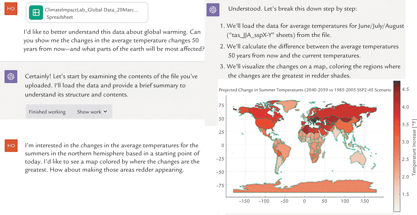 Multifunctional interactive workspaces. In a direction of innovation related to plugins, we see the rise of integrated interactive experiences that promote human–AI collaboration by enabling users and AI components to work together in a step-by-step manner on problem-solving, where multiple tools, data analysis abilities, and code creation are made available in a collaborative approach to solving problems and subproblems. A portion of a sample session of such a multifunctional interactive workspace provided by OpenAI named Advanced Data Analysis is displayed in Figure 8.11.
