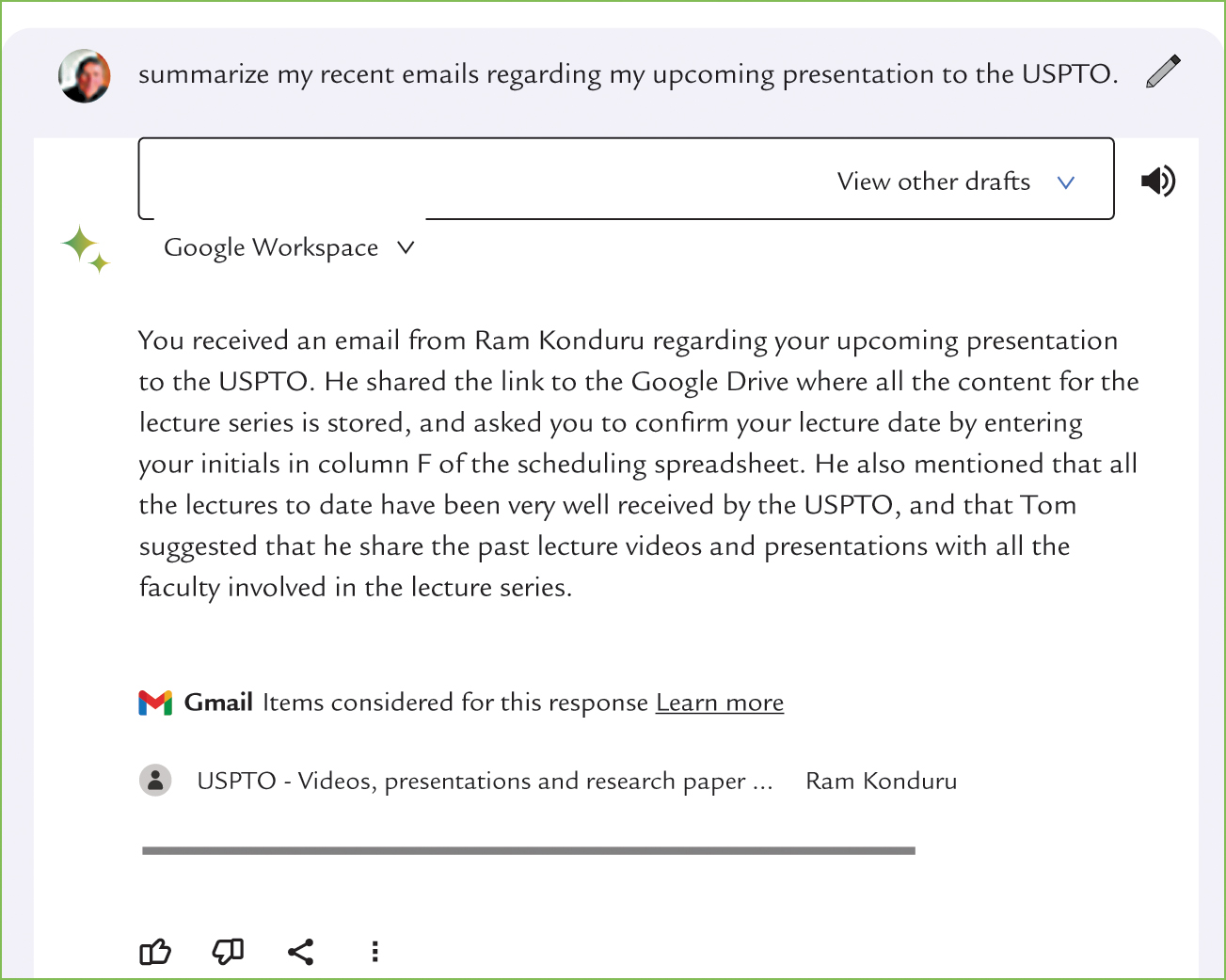Figure 8.14. A conversation with Google’s Bard about the content of the user’s Gmail and Google Docs. Created by Tom Mitchell using the Google Bard web interface.