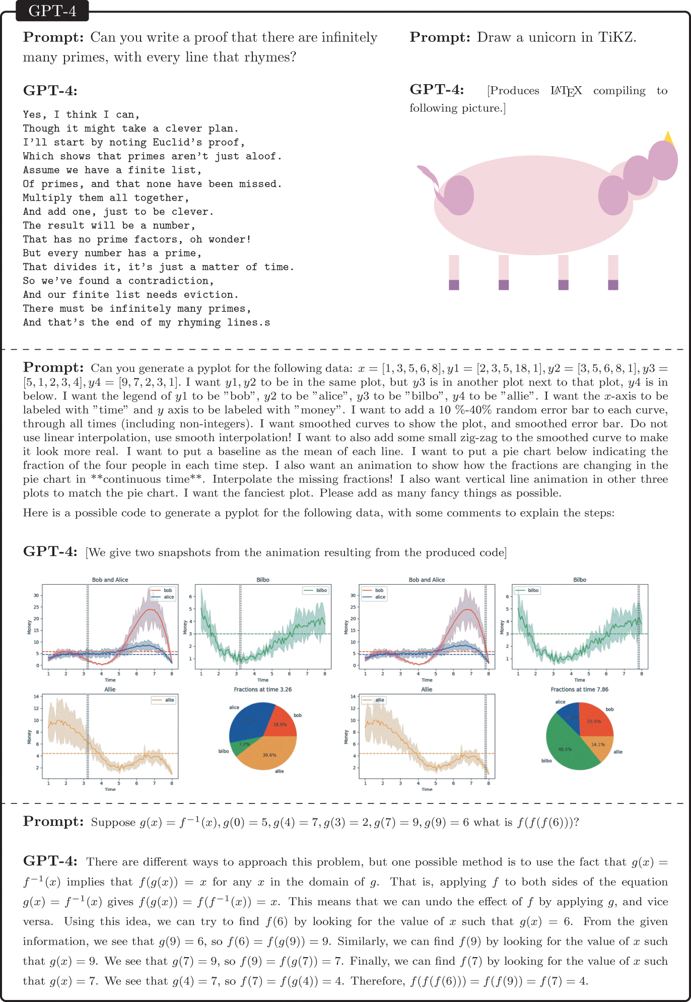 Figure 8.5. A sample of diverse prompts and output to an early version of GPT-4. Sébastien Bubeck et al., “Sparks of Artificial General Intelligence: Early Experiments with GPT-4,” arXiv, April 13, 2023, https://