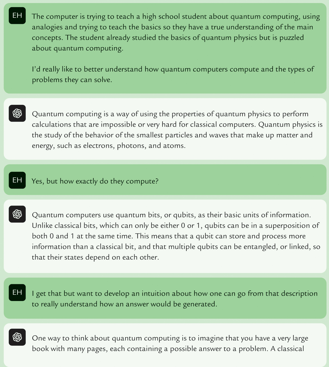 Figure 8.21. Snippet from education session on quantum computing, showing rich dialog, signs of pedagogical competence, and responsiveness. Full session available at https://