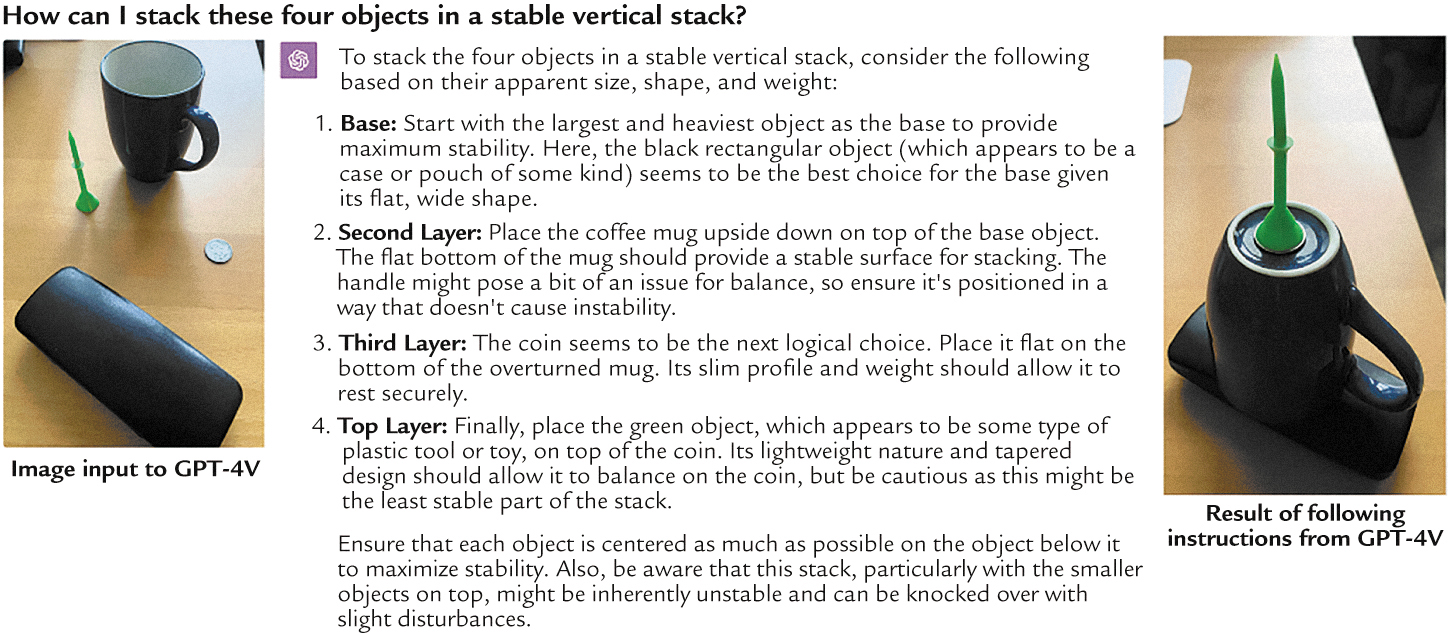 Figure 8.9. An interaction with GPT-4V, which accepts image as well as text inputs. Here the input image on the left shows four items on a desktop. The input request to GPT-4V is “How can I stack these four objects in a stable vertical stack?” When the output answer from GPT-4V (shown in the middle) is followed, it produces the vertical stack shown on the right. Created by Tom Mitchell using GPT-V website.