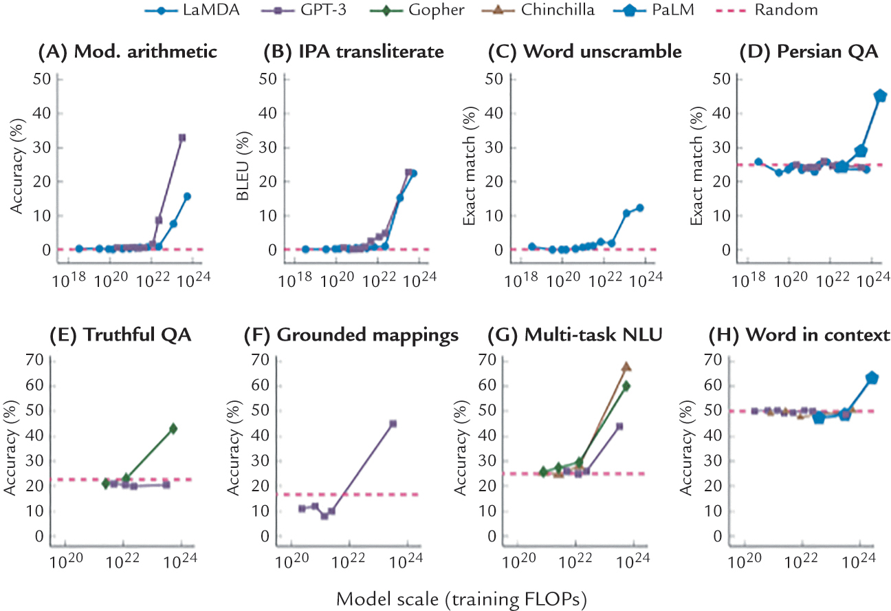Figure 8.4. Jumps in capabilities on eight reasoning benchmarks for five different generative language models as a function of the number of floating-point operations (FLOPs) invested for optimizing model parameters during training. The jumps have been referred to as the emergence of specific capabilities at particular thresholds of model sophistication. Jason Wei et al., “Emergent Abilities of Large Language Models,” arXiv, October 26, 2022, https://