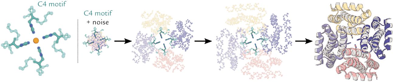 Figure 8.17. Supercharging protein design. Use of diffusion modeling methods to design proteins. In this case, a protein is designed with conditioning on a given motif. See Joseph L Watson et al., “De Novo Design of Protein Structure and Function with RFdiffusion,” Nature 620, no. 7976 (August 2023): 1089–1100, https://