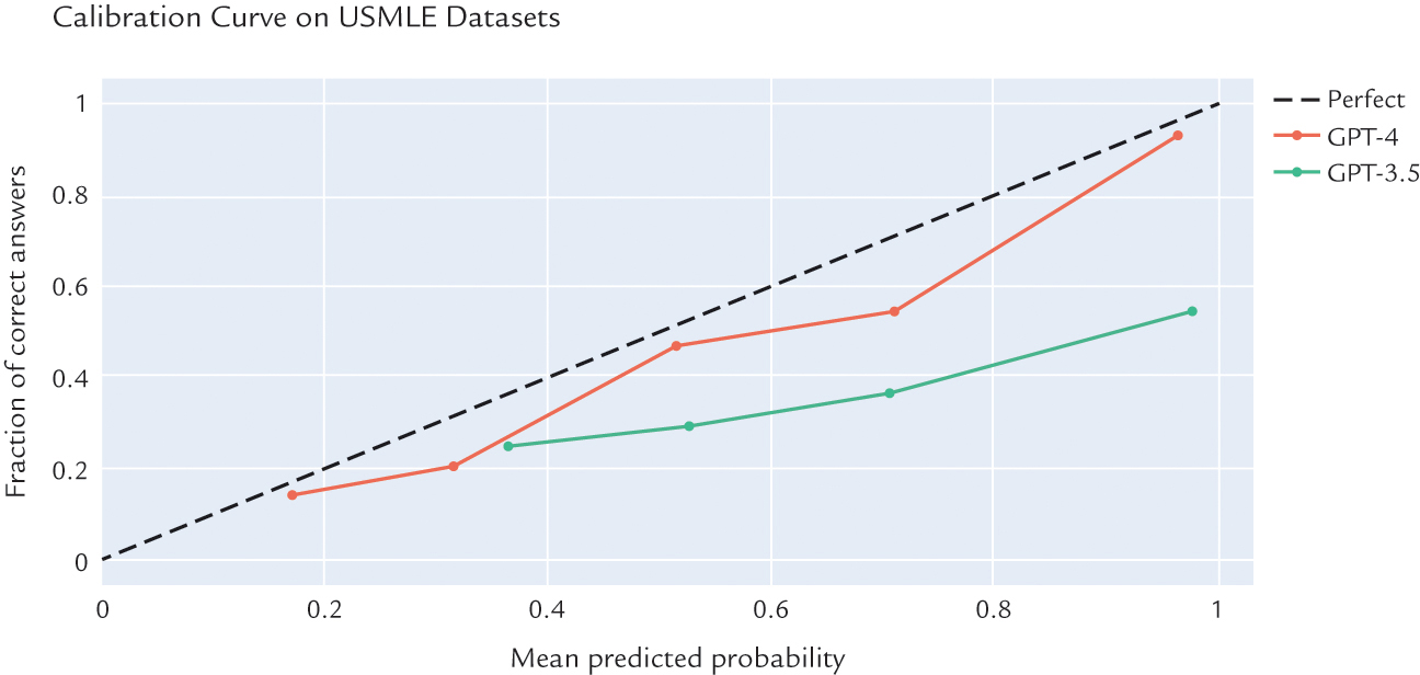 Figure 8.8. Calibration of confidence of GPT-4’s answers in response to challenge problems drawn from medical competency exams. Harsha Nori et al., “Capabilities of GPT-4 on Medical Challenge Problems,” arXiv, April 12, 2023, https://
