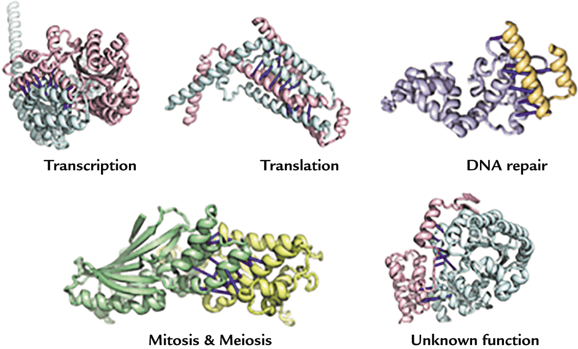 Figure 8.16. Decoding protein complexes. In work moving beyond structure, DNNs have been applied to identify likely protein complexes in eukaryotic cells. The complexes have been linked to processes of transcription, translation, DNA repair, mitosis and meiosis, metabolism, and protein transport within cells and across membranes. The dark blue lines indicate likely points of contact predicted between the proteins. The function of some of the identified complexes are mysteries. See Ian R Humphreys et al., “Computed Structures of Core Eukaryotic Protein Complexes,” Science 374, no. 6573 (December 10, 2021): eabm4805–eabm4805, https://