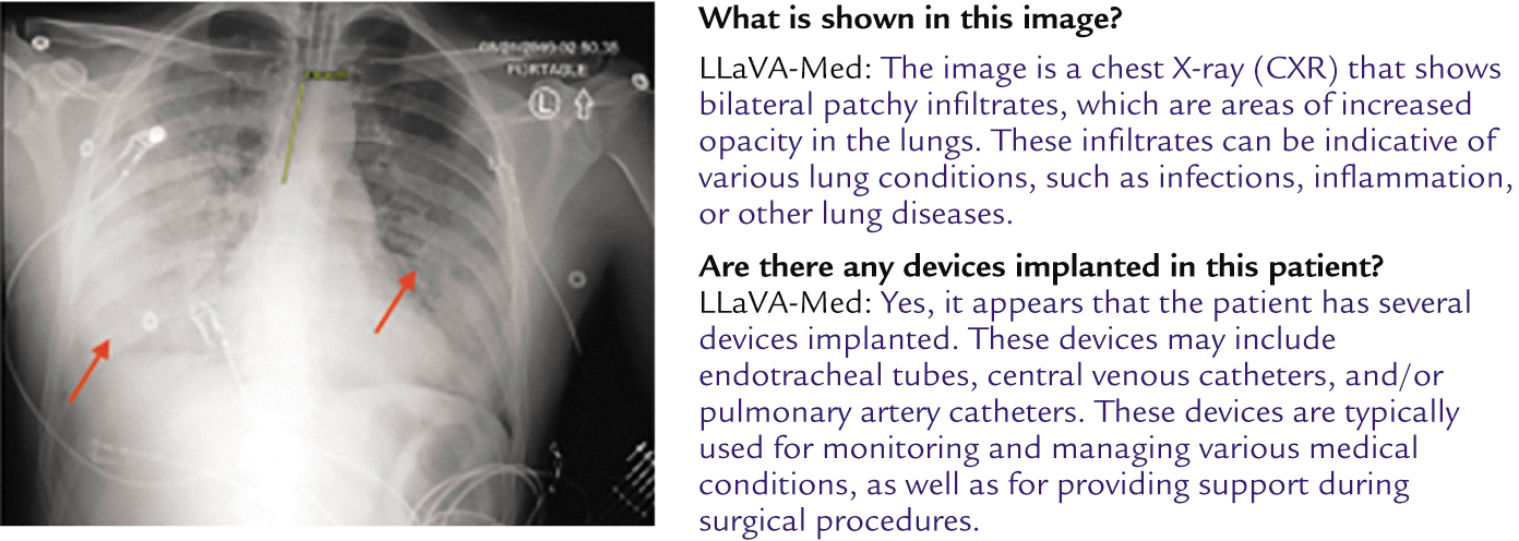 Figure 8.19. Rise of multimodal models. Creating a multimodal medical imaging model by fine-tuning a generalist open-source model with millions of aligned images and captions accessed from the openly available medical literature. Chunyuan Li et al., “LLaVA-Med: Training a Large Language-and-Vision Assistant for Biomedicine in One Day,” in Proceedings of the 37th International Conference on Neural Information Processing Systems, NIPS ’23 (Red Hook, NY: Curran Associates, 2024), 28541–28564.