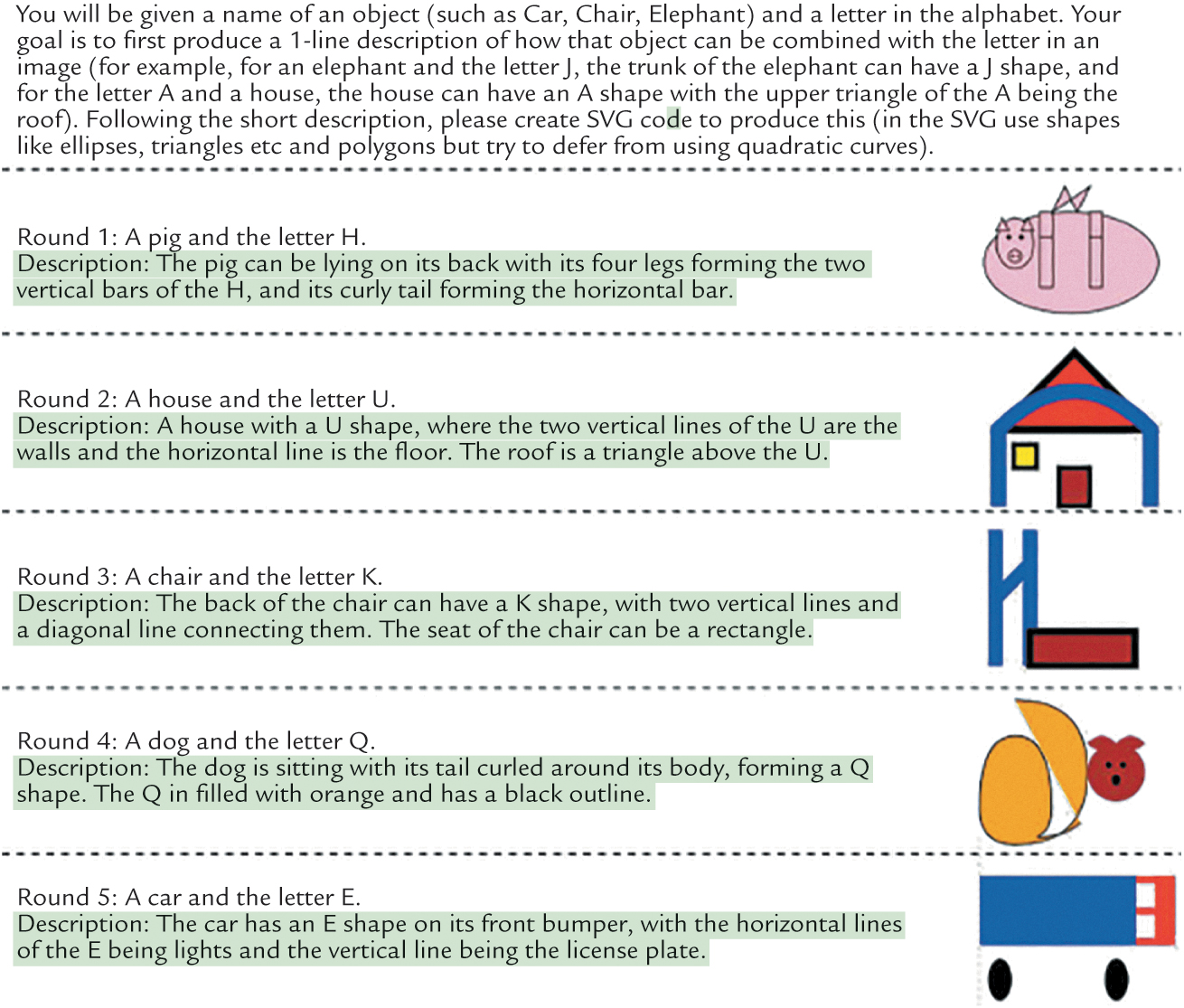 Figure 8.6. Prompts and output demonstrating surprising powers of “compositionality” demonstrated by an early version of GPT-4. Bubeck et al., “Sparks of Artificial General Intelligence.”