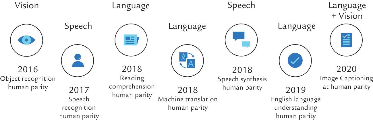 Figure 8.2. AI at an inflection. Deep neural networks have fueled advances in capabilities on benchmarks designed as top challenges for AI systems. This figure shows competencies of AI models where human parity on the challenge problems was reached on seven benchmarks.