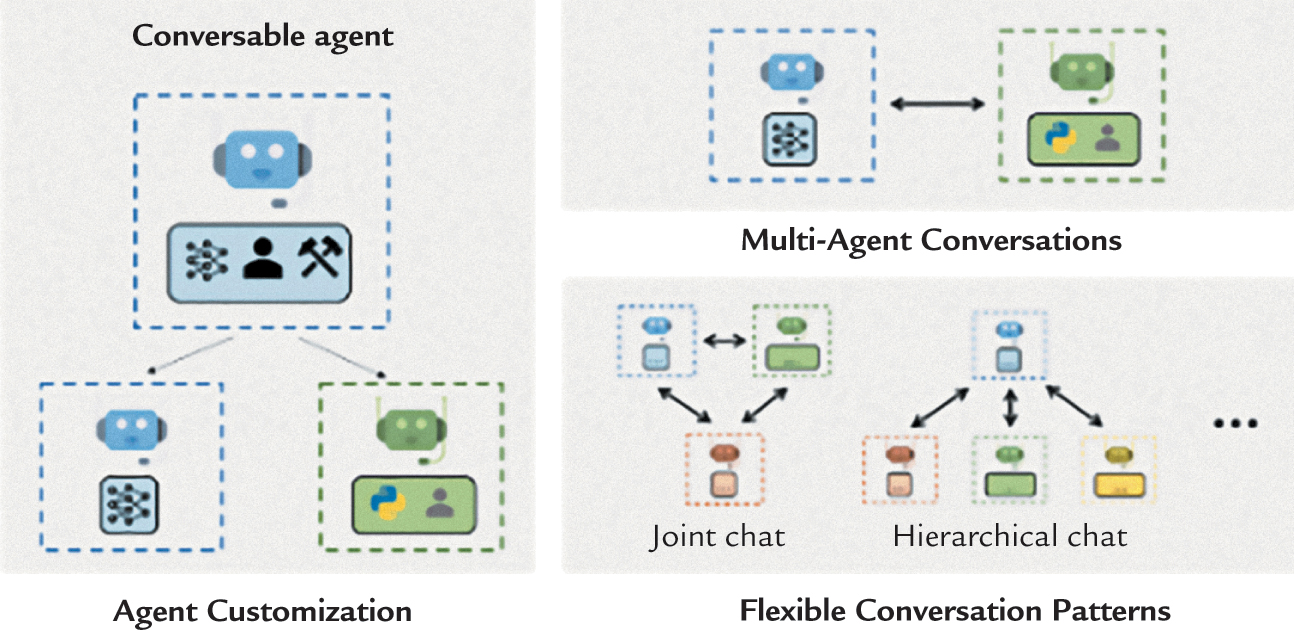 Figure 8.13. AutoGen orchestration framework for generative AI models allows the efficient specification of roles and flows of generations. Qingyun Wu, Gagan Bansal, Jieyu Zhang, Yiran Wu, et al., “AutoGen: Enabling Next-Gen LLM Applications via Multi-Agent Conversation,” paper presented at the Conference on Language Modeling, Philadelphia, PA, October 7–9, 2024.
