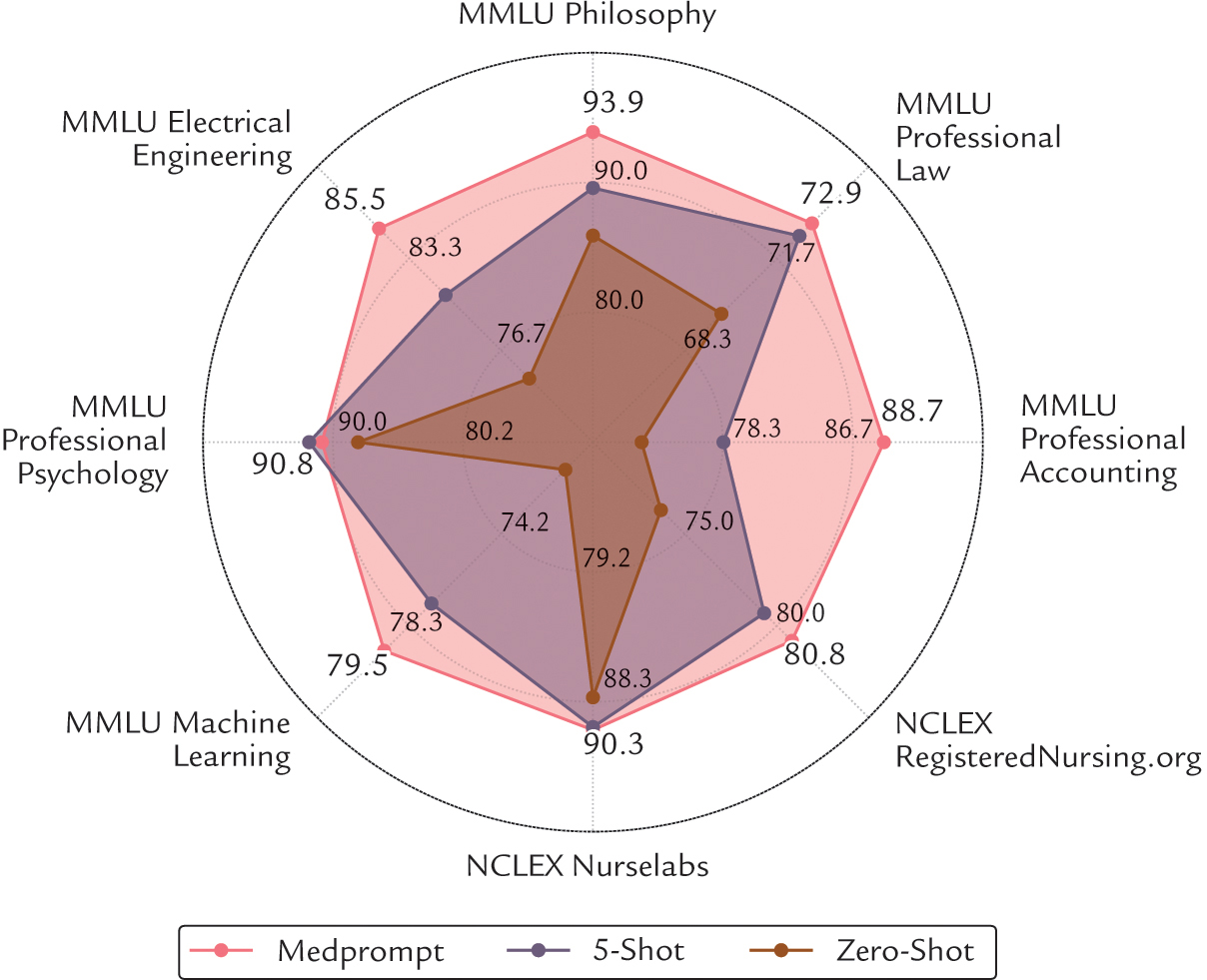 Figure 8.7. Prompting strategies can be used to guide generalist models to act as specialists. This figure shows comparative analysis of simple versus more sophisticated prompting strategies for steering GPT-4 to perform as a specialist on competency benchmarks in multiple realms. Harsha Nori et al., “Can Generalist Foundation Models Outcompete Special-Purpose Tuning? Case Study in Medicine,” arXiv, November 27, 2023, https://