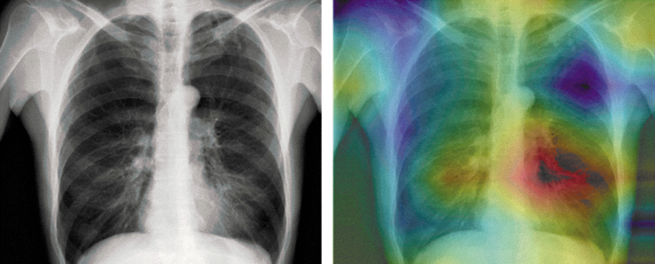 Figure 8.1. Visualization generated by CheXNet model, highlighting a region in a radiological image of the thorax, where the system recognizes right pleural diffusion. Pranav Rajpurkar et al., “CheXNet: Radiologist-Level Pneumonia Detection on Chest X-Rays with Deep Learning” arXiv, December 25, 2017, https://