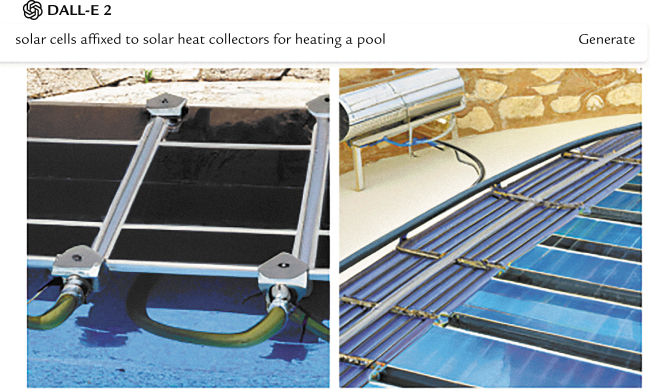 Engineering brainstorming and design. Generative AI, including problem-solving, guidance, and visualization of novel designs might provide a transformative toolkit to boost engineers’ creativity and innovation. Generative AI models trained to have language, imagery, and multimodal capabilities can help scientists to formulate, explore, and visualize complex concepts or designs that they might not have considered otherwise. There are opportunities for such models to serve as collaborative partners, providing instant feedback or making suggestions based on prompts describing goals. Figure 8.22 shows an early exploration with the DALL-E2 system of visualizations of designs for a combination of solar water heating and power generation.