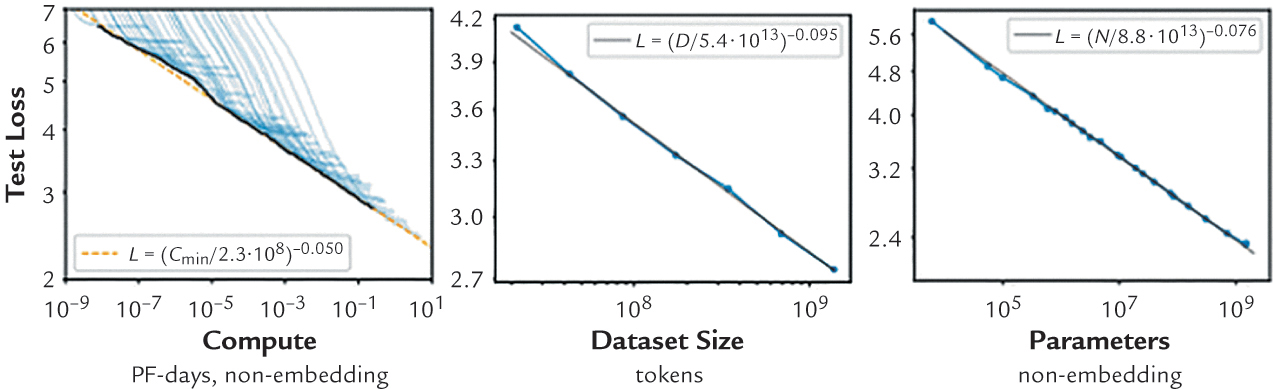 Figure 8.3. Scaling law analyses. Jared Kaplan et al., “Scaling Laws for Neural Language Models,” arXiv, January 22, 2020, https://
