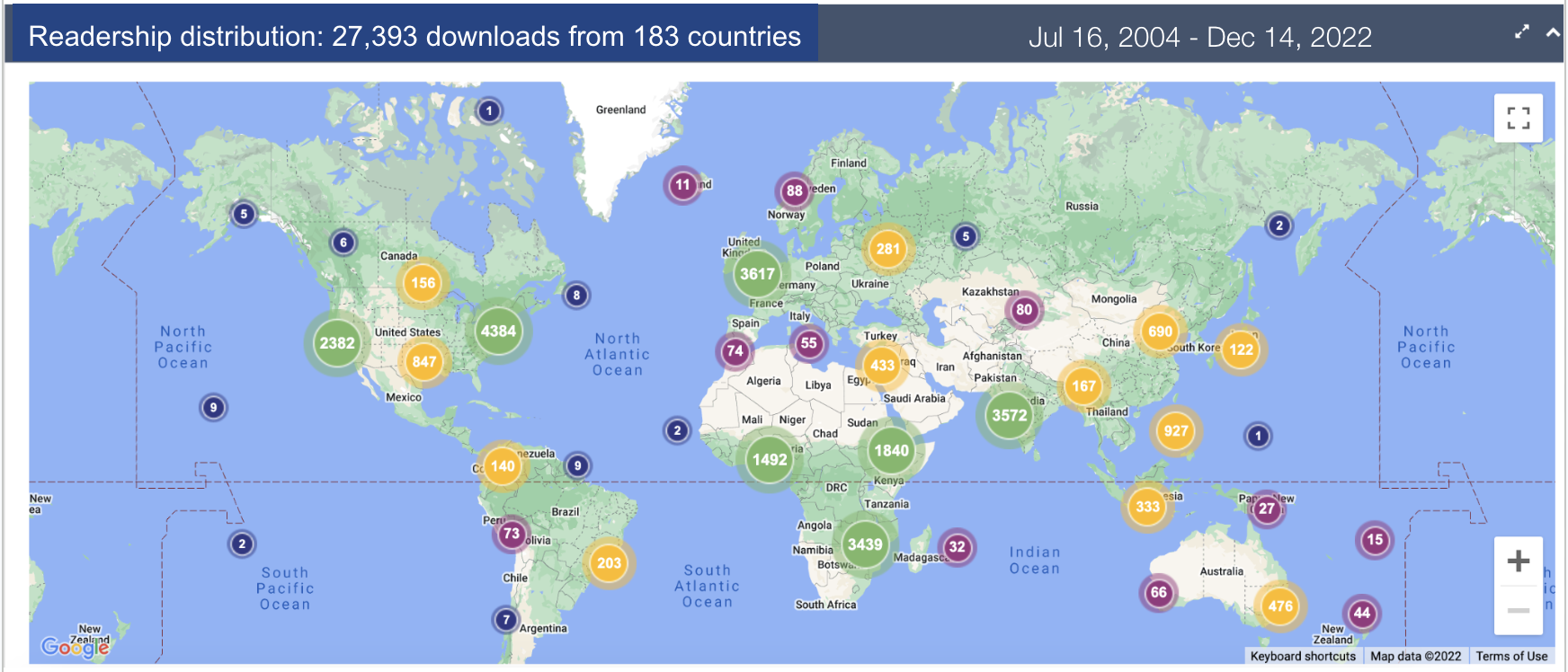 - Established Presence: The Journal has proven itself to be a great asset! It has carved out a niche, and has gained traction with little effort with a total of 27,393 downloads across 183 countries (with 8,586 in just the last year!) (Figure 3)