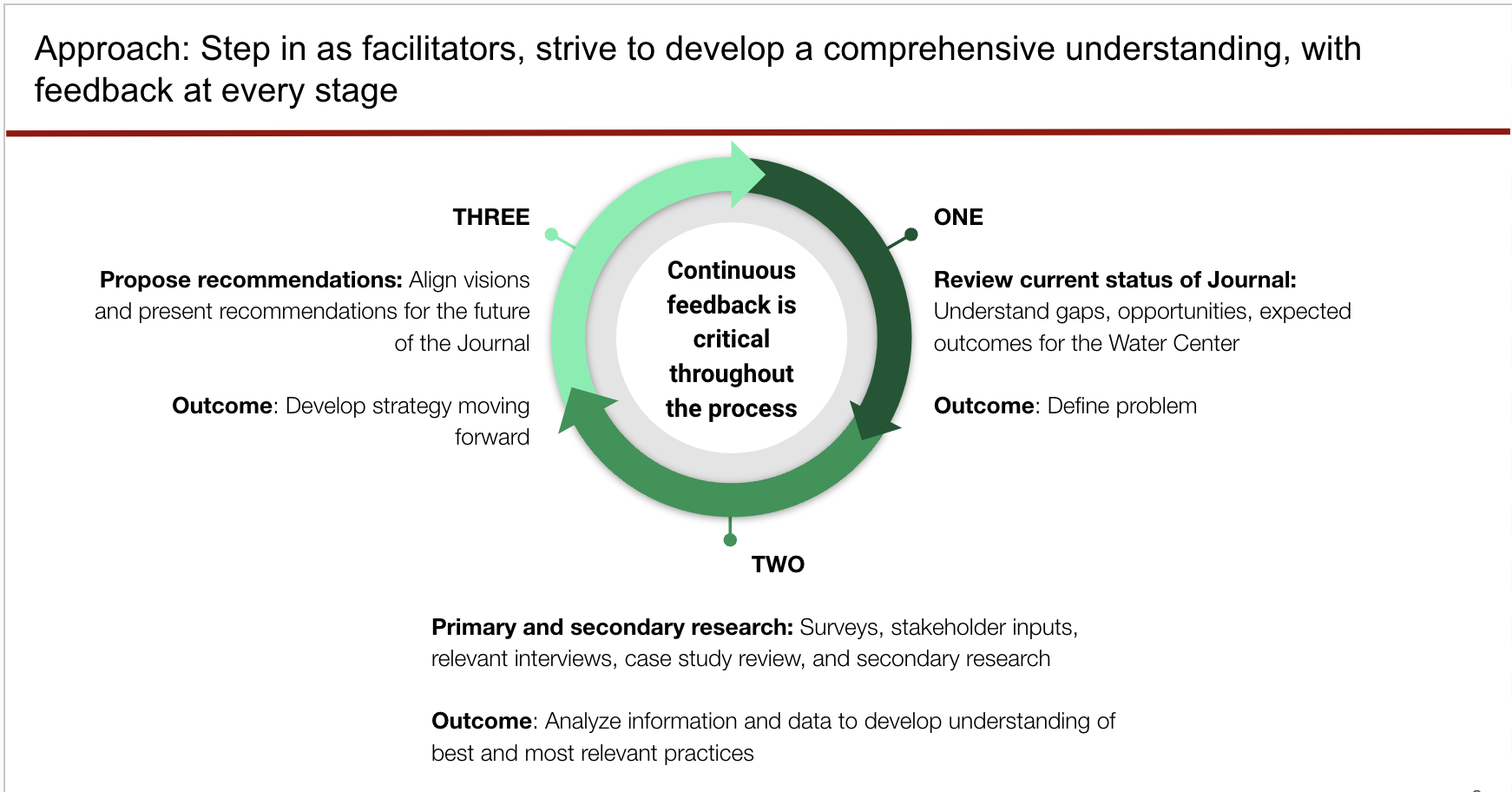 Over the past ten years, the wH2O Journal (Journal of Gender and Water), now known as the International Journal for Water Equity and Justice (IJWEJ), has made significant strides in the field of clean water and sanitation.As we mark the launch of our tenth volume, we take a moment to reflect on our journey and the future of the journal.The wH2O Journal has been under the University of Pennsylvania (Penn) ambit and most recently housed under the Water Center at Penn (see Figure 1 for the detailed timeline). As the journal approached its eleventh year, we recognized that it was imperative to re-evaluate its progress and assess the relevance of the topic in the current global context. For this project, we used a framework centered around design thinking principles. We embarked on a comprehensive research journey to identify key trends and assess comparable journals, ensuring that our vision and strategic roadmap align with the needs of our stakeholders. We conducted interviews, surveys, research, and reviewed case studies, while closely working with stakeholders to get feedback at every stage (Figure 2).