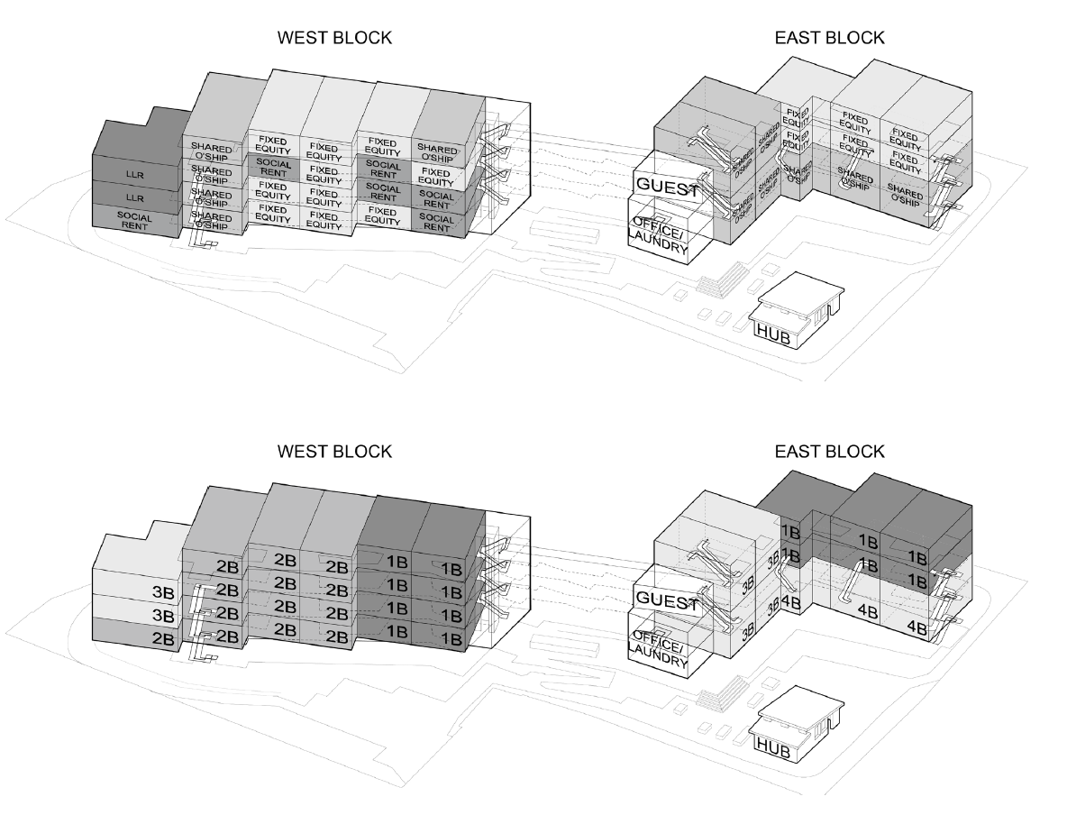 The design process began before the list of residents was in place with the early forging of the Ten Guiding Principles, which proved invaluable in directing the course of the project. RUSS commissioned an initial ācontrol scheme" from the architects Architype, in consultation with architect Jon Broome, to confirm what could be built on the site in terms of public approvals. In this way, the potential resident group and members-at-large could proceed with the co-design process without the danger of creating false expectations around what was possible.