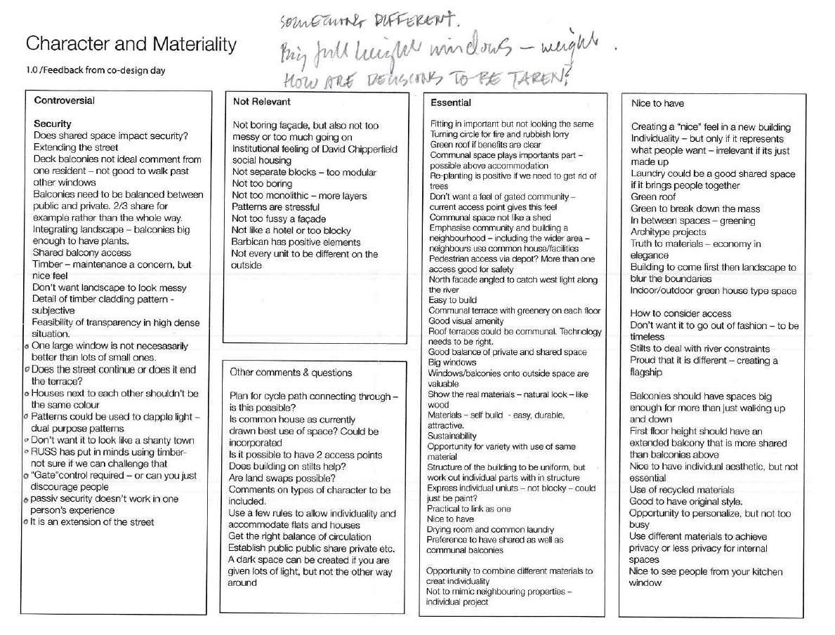 A kickoff Design Festival of Ideas followed. It introduced āthe control schemeā and the process of submitting planning applications. There was a group site visit, followed by an initial workshop and a social event. For the workshop (at a library), the potential residents split up into groups and addressed 4 themes that then structured the entire design process: Site Planning, Character and Feel, House Plans, and Sustainability and Energy/Self-Build. Each theme was introduced with the RUSS vision for the topic, a summary of design decisions that had been proposed by the architects, and a series of questions and printed images as prompts for discussion. Participants noted their ideas with the canonical post-it note. Comments were recorded in categories of Essential, Nice to Have, Not Relevant and Controversial.