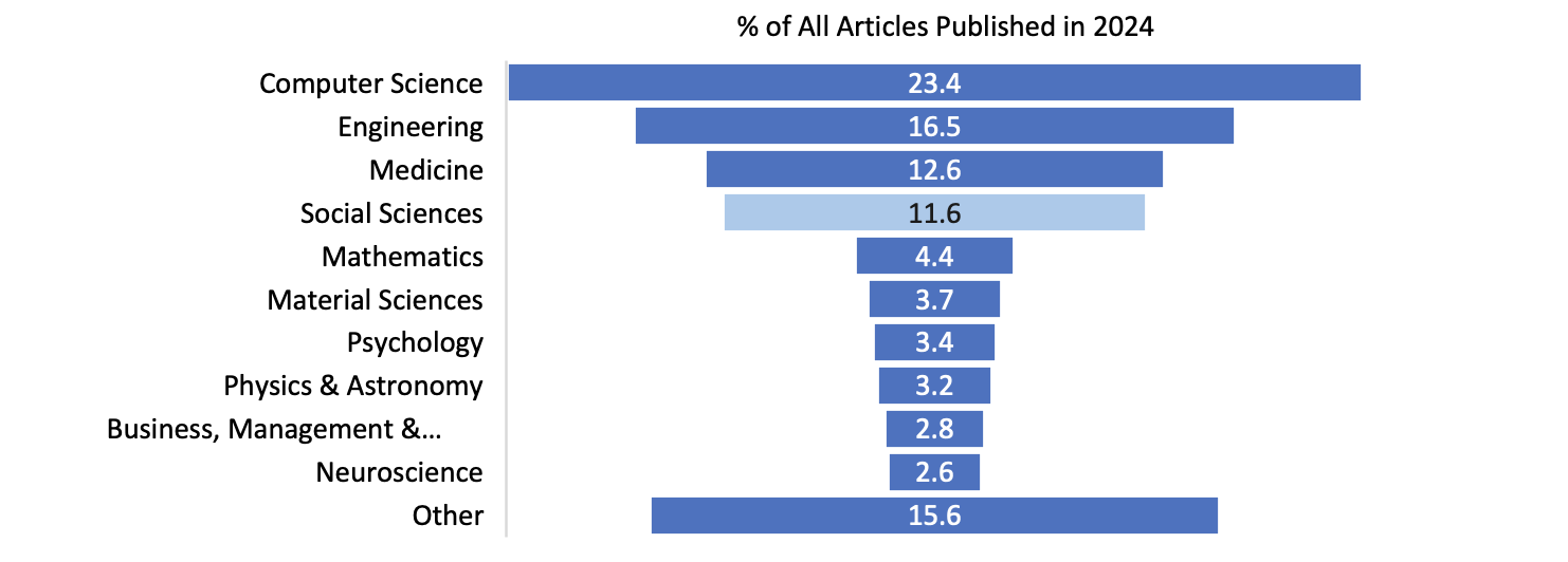 Una búsqueda [1]en la base de datos Scopus arroja un total de 10 976 artículos revisados por pares en inglés en 2024, que abarcan 11 áreas temáticas principales. (Tenga en cuenta que algunos artículos están clasificados en varias categorías disciplinarias).