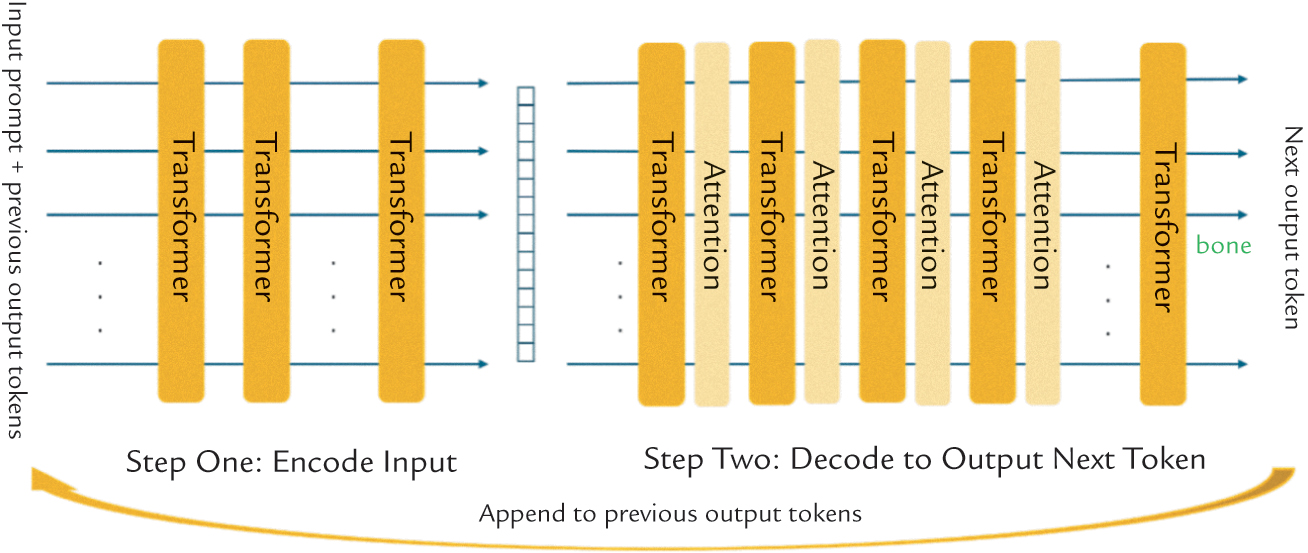 Figure 3.5. Transformer architecture, step two: decode to output next token; attention layers provide context. Drawn from John Launchbury, “The Trajectory of AI,” presentation at Galois, Portland, OR, December 2023.