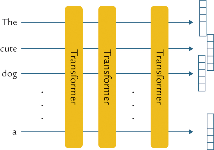 The manifold hypothesis states that real-world high-dimensional data lie on low-dimensional manifolds embedded in the high-dimensional space.14 Thus, we can imagine that each transformer via linear and nonlinear operations stretches and squashes manifolds in this space, passing the transformed manifold onto the next layer. While we do not know if the manifold hypothesis is true, minimally it provides good intuition as to what happens at each layer. The result of this step is that each input word is embedded in this space. Embeddings make it possible to represent symbolic information numerically. Each word gets represented as a vector of floating point numbers, each of which represents some feature of the word (see left-hand side of Figure 3.4). Embeddings convert high-dimensional data into a low-dimensional space.