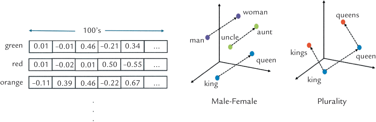 What is interesting about embedding spaces is that both distance and direction have meaning; hence we often use the term vector embeddings. From embeddings we can learn abstract concepts not explicitly represented. In the embedding shown in the right-hand side of Figure 3.4, “king” is to “queen” as “man” is to “woman” represents the abstract concept of gender. And “king” is to “queen” as “kings” is to “queens” represents plurality. (These examples are taken from Figure 2 in Mikolov, Yih, and Zweig 2013.15)