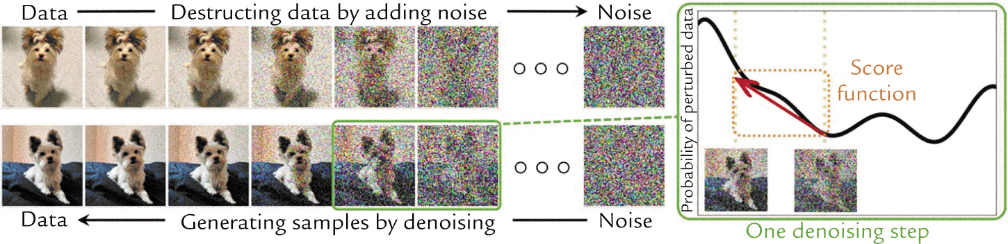 As mentioned earlier, we can generate new images using not just LLMs but diffusion models. The diffusion model was inspired by nonequilibrium statistical physics;11 natural diffusion processes are found in physics, chemistry, and biology. In a diffusion model, the forward process systematically adds noise to an image; we then learn a reverse process by denoising, and in this process generate a new image (Figure 3.2).