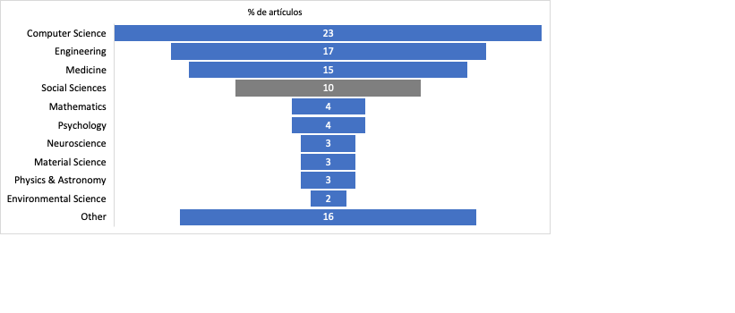 La Figura 1 a continuación muestra que las ciencias sociales representaron un porcentaje relativamente pequeño (~10%) del conjunto total de 8219 artículos relacionados con XR en 2022. Como era de esperar, la informática fue el campo de producción líder, seguido de la ingeniería y la medicina, que en conjunto representaron alrededor del 55% de la producción total de publicaciones . Hay varias razones para este predominio, incluido el hecho de que todos estos son campos aplicados, no solo a la vanguardia del uso de tecnologías XR, sino que también las desarrollan activamente